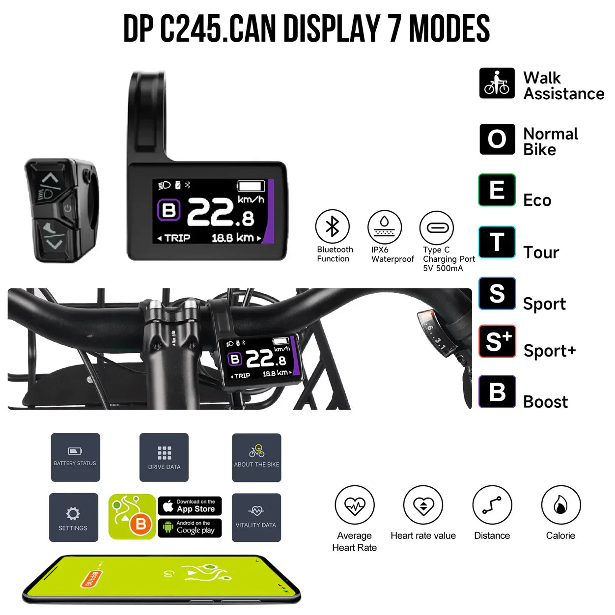 Display: Bafang DP C245 CAN, 6 Unterstützungsstufen (PAS), 7 Fahrmodi, Bluetooth, 5 V, 500 mA Typ-C-Ladeanschluss.