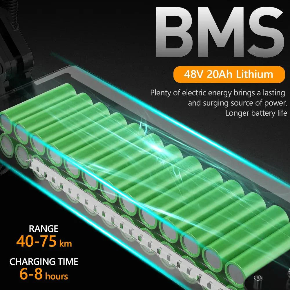 45 km/h Höchstgeschwindigkeit und bis zu 40–75 km Fahrt ohne Aufladen. Dies ist ein Elektroroller für Erwachsene, der für das tägliche Pendeln und fürs Gelände geeignet ist.