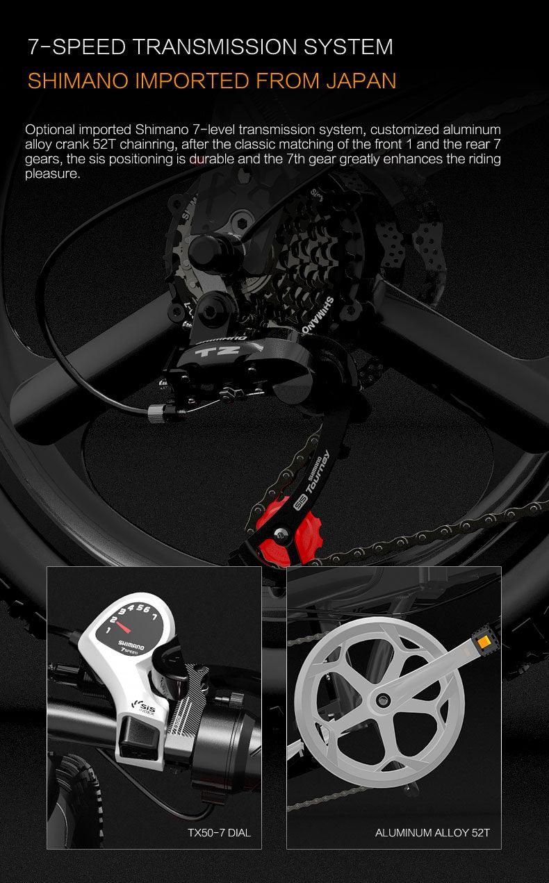 Optionales importiertes Shimano 7-Stufen-Getriebesystem, angepasstes 52T-Kettenblatt mit Kurbel aus Aluminiumlegierung, nach der klassischen Abstimmung des vorderen 1 und des hinteren 7-Gangs ist die Sis-Positionierung langlebig und der 7. Gang steigert den Fahrspaß erheblich.