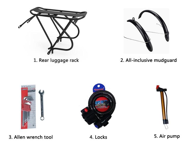 Durch die Verwendung einer Vorderradgabel mit doppeltem Ölfederstoßdämpfer wird dem Fahrer bei holpriger Fahrt ein noch komfortableres Fahrgefühl geboten. Der große Raddurchmesser von 20 Zoll ist durch Schlaglöcher und unbefestigte Straßen abgedeckt, sodass Bremsschwellen problemlos überwunden werden können. Die Reifenbreite beträgt 6 Zentimeter und bietet Rutschfestigkeit und Stoßfestigkeit bei größerer Spannweite.