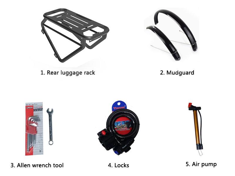 Dieses neue und verbesserte Elektrofahrrad ist mit einem komfortablen, geräumigen und robusten Aluminium-Gepäckträger ausgestattet, der sich sehr gut für Fahrten mit Ihren geliebten Haustieren oder zum Mitnehmen von Verwandten und Freunden eignet. Auch praktisch, um alles Wichtige mitzunehmen, egal ob Sie zu einem Picknick aufbrechen oder von der Arbeit nach Hause fahren! Die integrierten Schutzbleche schützen Sie vor den Elementen, egal ob bei Regen oder Sonnenschein.